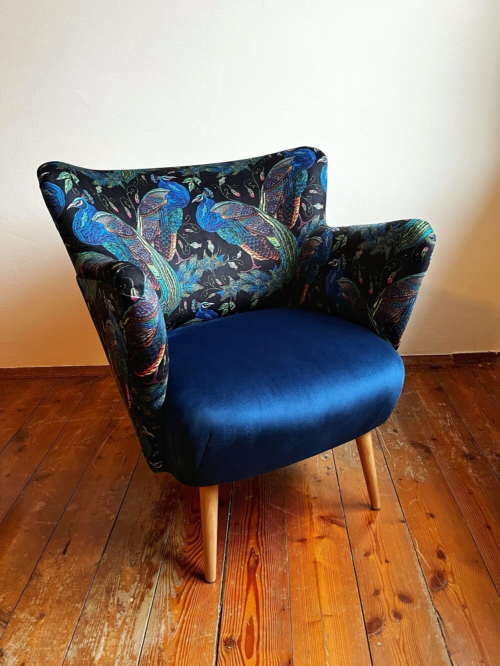 Diese beiden Vintage-Sessel habe ich diesmal mit einem wunderschönen Pfaustoff bezogen, der einen ganz neuen Look in meine bisherige Stilwelt bringt.