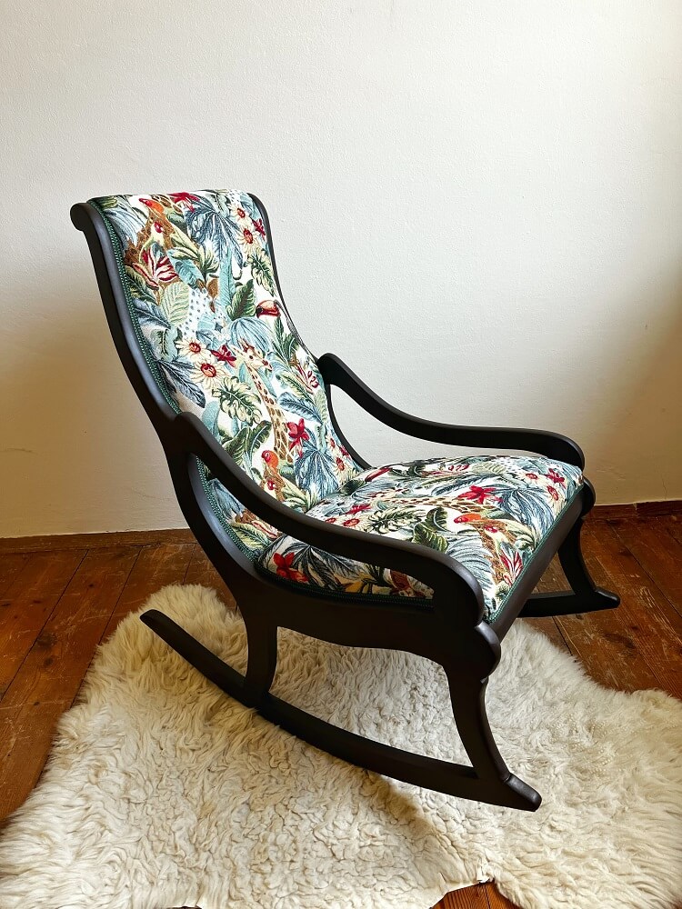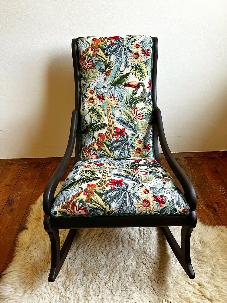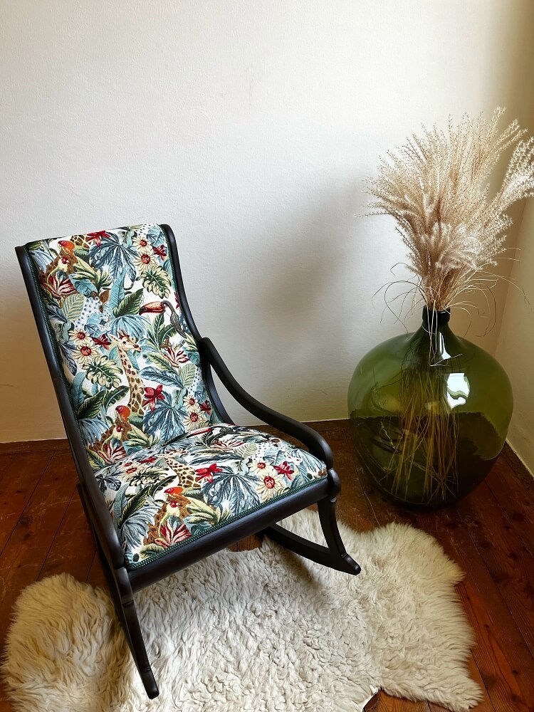 Ein wunderschöner farbenprächtiger Schaukelstuhl mit Tiermotiv, passend fürs Kinderzimmer. Auch für Erwachsene geeignet.
